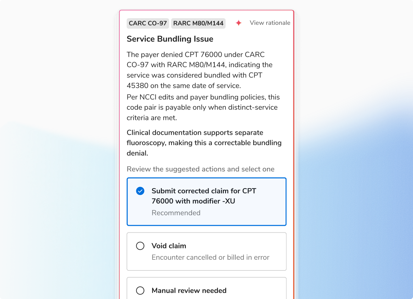 Automatically works low-dollar, high-volume denials teams can’t reach