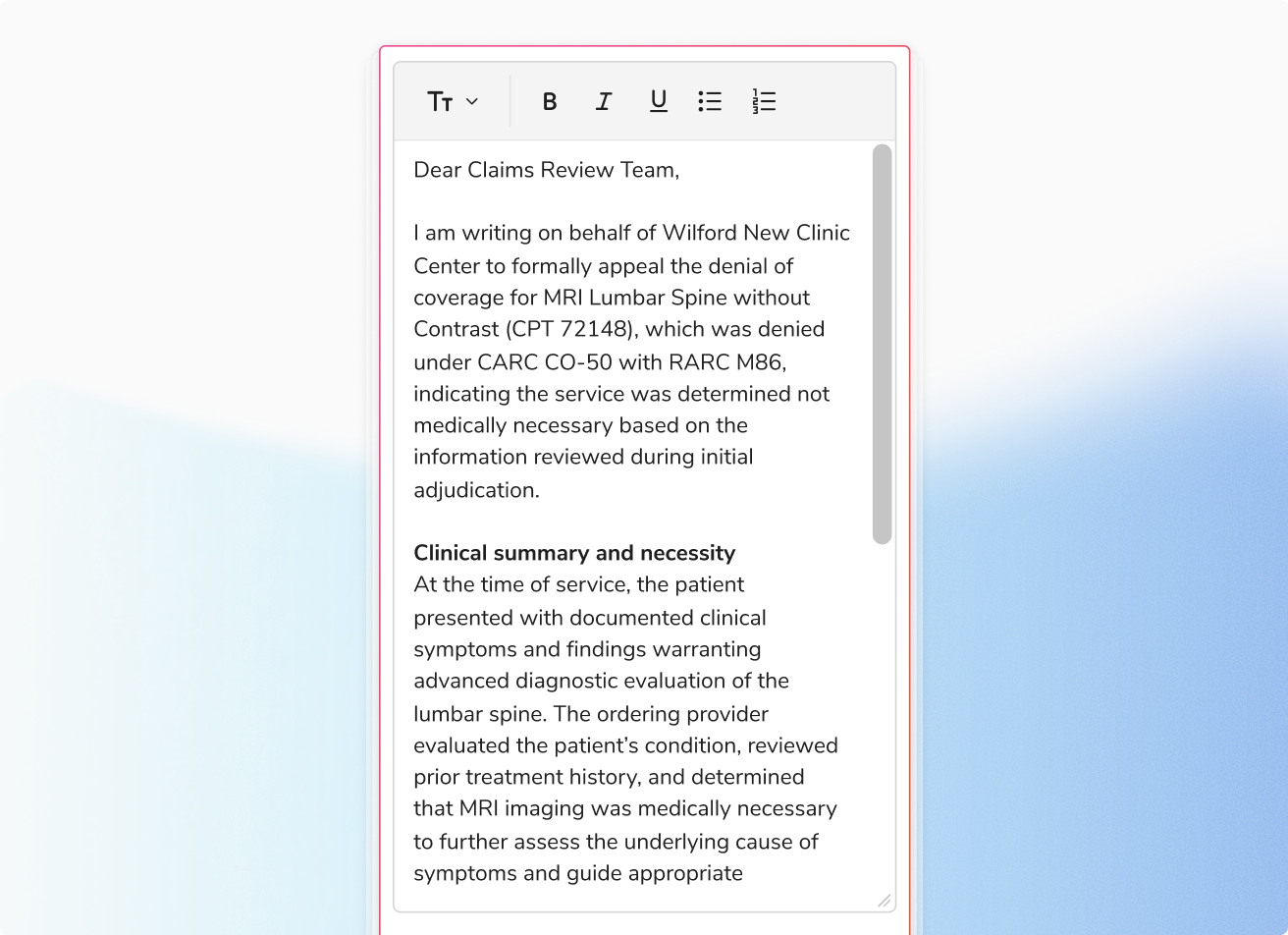 Flow drafts appeals using payer-specific evidence and language, leveraging past approvals to improve success rates and turnaround times.