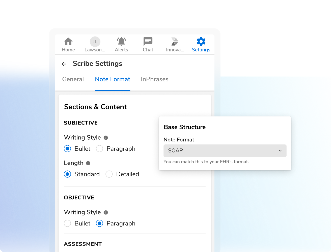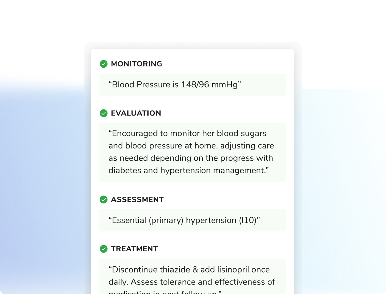 Ambient Scribe captures the conversation in real time and generates a structured SOAP note, allowing the physician to focus on clinical reasoning rather than documentation mechanics. Specialty-specific templates adapt automatically so the cardiologist sees NYHA classification prompts while the primary care physician gets HbA1c trends and ICD-10 specificity guidance, all without interrupting the patient conversation.