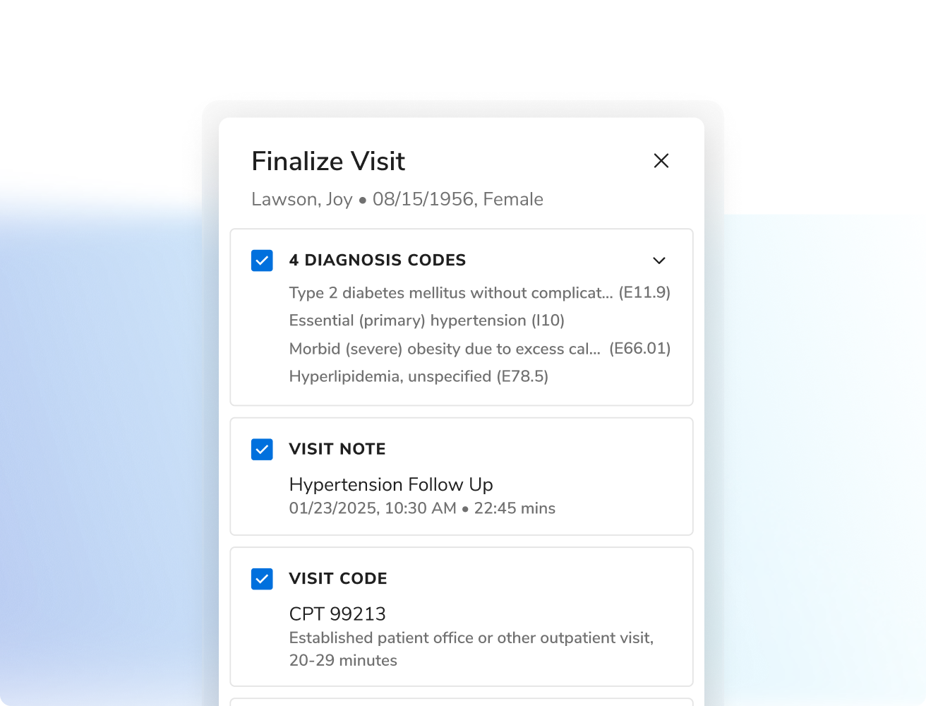 EMR Writeback structures the information at the point of capture so it flows directly into the fields your downstream teams need. Problem lists populate with appropriate specificity, quality measures trigger without abstraction, and care management workflows begin with structured tags already in place.